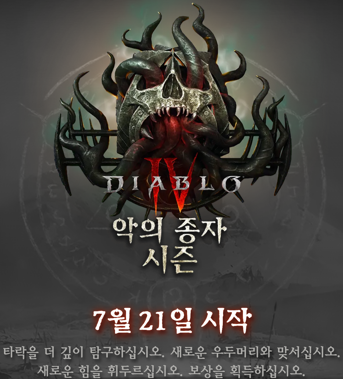 악의 종자 시즌 – 2023년 7월 21일 오전 2시 (한국시간) 디아블로4 첫 시즌 개막 안내 2023년 6월 6일 (얼리억세스는 6월 4일) 발매하여 프리시즌으로 다들 게임은 재밌게 즐기셨나요? 사실상 디아블로 시리즈는 시즌제가 메인인 게임이라 봐도 무방한데, 이제 선풍적인 인기를 끌며 말도 많았던 디아블로4의 메인요리가 여러분을 즐겁게 해줄 시간이 다가왔습니다. 드디어! 이제 7월 21일 오전 2시 (한국시간) 에 첫 시즌이 여러분들을 맞이하게 될 예정입니다. 다만, 시간이 오전 2시부터라 살짝 아쉽지만 그래도 디아4 개발자들이 예고한 것처럼 7월 중순 이후에 시즌을 맞이할 수 있어서 다행입니다. 자, 이제 다가올 첫 시즌에 대한 정보를 간략하게 알아볼까요? 시즌? 다시 키워? 디아 시리즈를 처음 접하신 분들이라면 대체 왜 열심히 시간들여 키워놨는데 다시 새로 키워? 라고 반문하실지도 모르겠습니다. 저도 다시 키우는 것에 대해서 부담이 없지는 않죠. 특히, 직장인이나 수험생, 유부남 등 시간을 게임에 할애하기 힘든 분일수록 더욱 그렇게 느끼실 수 있겠습니다. 하지만 이미 디아4를 어느 정도 즐기신 분들의 공통적인 입장은 대략 70 중반에서 80 레벨 정도에 도달하면 막상 할게 없다 또는 현타온다 라고 하십니다. 그 이유인즉, 대부분 70레벨 전후로 각 직업에 맞는 위상과 나름 옵션 괜찮은 템으로 세팅이 완료된 상태고 거기서 더 좋은 아이템을 얻기란 쉽지 않은 상태가 됩니다. 빌드 세팅하는 재미가 반감이 되고, 제대로된 템을 얻지 못해 성장시키지 못한다면 레벨링 스케일 때문에 레벨을 올려도 몹들도 레벨이 높아져서 오히려 캐릭터가 퇴보하는 수준이 되는데요. 이렇게 교착 상태에 빠지는 것을 막기 위한 하나의 장치라고 볼 수 있습니다. “키우기가 힘들어졌어? 그럼 모두 함께 다시 처음부터 해보자!” 라는 느낌이랄까요. 대신 시즌이 끝나도 시즌제 동안 키운 캐릭터는 스탠 캐릭터(디아2, 3 용어 : 영구적 캐릭터)로 변경되어 영원의 영역(디아4에서의 스탠)에서 계속 플레이하실 수 있습니다. 다만, 시즌 한정 콘텐츠라던지 시즌 아이템들은 못쓴다고 봐야됩니다. 그래야 다음 시즌에도 또 참여해서 즐길 수 있겠죠? 이러한 디아4 개발자들의 입장은 이번 시즌 안내문에서도 여실히 볼 수 있는데요. 아래에 첨부했으니 개발자들의 철학이 궁금하시다면 한 번 읽어보시는 것을 추천 드립니다. 이런 시즌이 저처럼 부담으로 느껴지시는 분들을 위한 당근도 마련이 되어 있습니다. 바로 시즌 전용 퀘스트와 장비, 외형 변경할 수 있는 스킨, 배틀 패스를 통한 성취감 달성, 기존 프리시즌 동안 달성했던 명망작, 지도 밝히기 및 캠페인 생략 등의 유저 편의성도 준비되어 있으니 부담 느끼실 필요 없이 다 같이 시즌에 참여해보시는 것은 어떨까 싶네요! 개발팀의 시즌 철학 시즌은 한시적으로 혁신적인 게임플레이 메커니즘을 성역에 도입할 수 있는 기회입니다. 시즌은 매번 초기화되므로, 과거 시즌에 도입됐거나 미래 시즌에 도입될 메커니즘 사이의 밸런스를 걱정할 필요 없이 견고한 영원의 영역을 기반으로 과감하고 재미있는 시즌 테마를 제작할 수 있습니다. 시즌은 플레이어들이 탐험하고 실험할 수 있는 공간이기도 합니다. 새로운 직업이나 좋아하는 직업의 다른 빌드를 시도해 보시기를 권장합니다. 시즌은 악마를 무찌르는 동시에 창의력을 발휘할 좋은 기회니까요. 또한, 시즌은 동등한 기회의 장을 제공합니다. 저희는 새로운 캐릭터들이 시즌 테마가 불러온 악몽 같은 도전을 정복하고 함께 시즌 여정을 진행할 수 있도록 시즌을 설계하였습니다. – 디아블로4 시즌 안내 발췌 – 시즌 테마 – 악마의 열매? 악의 심장! 악의 종자 시즌 특징 이번 시즌은 디아3때 있던 전설보석과 같이 이번 시즌 전용인 ‘악의 심장’을 아이템의 홈에 끼워넣어 여러 가지 빌드를 짜볼 수 있는 컨셉을 가지고 있습니다. 자세한 정보는 아직 알려지지 않았지만, 네 부류의 악의 심장 32개가 등장한다고 합니다. 아마 직업 전용 악의 심장과 공통 악의 심장으로 구성되어 있지 않을까 생각이 되는데요. 확인한 바로는 디아4의 인장처럼 분해와 조합으로 악의 심장을 만들 수 있어 보입니다. 자세한 내용은 정식 패치노트가 나오면 공유드릴게요. 또한, 같이 추가될 새로운 신규 위상 6개 (직업별로 1개씩 + 공통 2개)도 빌드의 다양성에 재미를 더해줄 것 같네요. 시즌의 꽃 – 시즌 여정과 배틀 패스 프리미엄 배틀 패스 보상 이번 디아4도 디아3와 같이 시즌 여정이 진행된다고 합니다. 시즌 여정은 시즌제 캐릭터가 시즌 기간동안만 할 수 있는 업적 퀘스트 같은 것인데요. 이와 함께 디아4 첫 시즌에서는 27개 무료 단계와 63개 프리미엄 단계 도합 90개의 단계로 구성된 시즌 전용 배틀 패스 시스템도 도입이 된다고 합니다. 배틀 패스 시스템에서는 내 캐릭터를 육성하는데 도움이 되는 각종 아이템과 보상을 얻으실 수 있습니다. 다만, 배틀 패스의 모든 보상은 모든 유저들이 이용하실 수 있는 것은 아니고, 프리미엄 배틀 패스를 구매하신 분들만 받을 수 있고 이는 개별로 판매하기도 하며 얼티밋이나 디럭스 제품으로