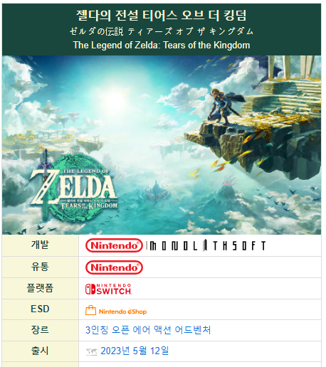 image source : 나무위키 기다리고 기다렸던 젤다 왕국의 눈물이 나온다는 소식에… 출시 전 예약구매를 통해 구매를 하였다. 나는 예약구매 특전으로 에코백을 받았으나… 바빠서 아예 젤다를 못해보다가… 이번 추석에 시간이 나서 드디어!! 젤다 왕국의 눈물을 수령한지 4개월이 넘어서야 드디어 해보네… 게임이름이 “젤다의 전설”이라서 보통 용사 이름이 “젤다”라고 생각하는데, 용사이름은 “링크”이고, 링크가 구하러가는 공주의 이름이 “젤다”이다. – 항상 왜 “링크의 전설”이아니고, “젤다의 전설”인지 궁금… 용의 눈물이라는 컨텐츠가 있어서, 지역을 돌아다니면서 스토리 영상을 보는 컨텐츠가 있다. 그것만으로도 재밌더라. 지금은 플레이타임 30시간정도이고, 컨텐츠 중반정도 온듯하다… 야숨에 비해 전반적으로 그래픽 퀄리티가 올라갔고, 스토리가 더 좋다. 사당과 보스 던전의 퍼즐 난이도도 전반적으로 쉬워졌으나, 보스전은 조금 어려워졌다. 전반적으로 전작인 야숨에서 아쉬웠던 부분이 많이 보강된 느낌이다. 입문난이도도 더 낮아져서, 정말 누구에게나 추천해 줄 수 있는 재미있는 게임이다. 그리고 제일 중요한 것은… 젤다가 더 예뻐졌다는 것이다. (내 느낌에는) 야생의 숨결 : 젤다 / image source : https://brunch.co.kr/@kkan/260 왕국의 눈물 : 젤다 / image source : https://m.blog.naver.com/rkocho/223102593593?isInf=true 왜 이번편의 젤다가 더 예쁜 거 같지… 아무튼 젤다가 더 예뻐진 느낌이 강하게 든다…