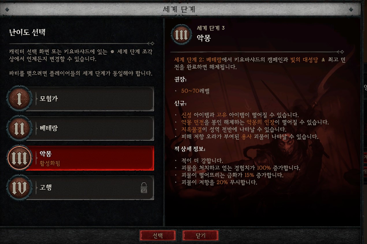 난이도 선택 창 디아블로4에서 악몽 난이도로 입성을 하시면 악몽 던전 레벨을 봉인 해제 시키는 인장이 나옵니다. 인장 시스템은 악몽 난이도에서 만나보실 수 있으며, 악몽 난이도 이후에서만 인장을 얻으실 수 있습니다. 그럼 디아블로4 인장 얻는 방법과 획득 위치를 알아보겠습니다. 획득처 정리 악몽의 인장 얻는 방법 디아블로4에서 악몽의 인장 아이템은 “악몽 난이도”이후부터 얻으실 수 있습니다. 획득처는 아래와 같습니다. ● 월드 보스를 처치 시 드랍 ● 군단 이벤트를 참여 시 드랍 ● 속삭임의 나무 임무 완료 시 아이템 박스에서 드랍 ● 악몽 던전 내부 몬스터 처치 시 드랍 디아블로4 악몽 난이도에서 게임을 어느정도 진행하다보면 자연스럽게 인장을 얻습니다. 소개한 획득처 중에서 초반은 속삭임의 나무 이벤트에서 얻으시는 걸 추천드리고, 이후부터는 자연스럽게 악몽 던전를 돌다보면 잘 나옵니다. 가방에서 소비용품 악몽의 인장 사용 방법 인벤토리 창을 열어 소비용품 가방 항목에서 얻으신 인장을 사용하실 수 있으며, 이 인장은 세계 단계 3 난이도부터 이용이 가능합니다. 지도를 확인하면 새롭게 추가된 던전 인장을 사용하면 디아블로4 성역내 맵에서 악몽 던전이 해금되며, 해당 던전을 찾아서 이동하여 클리어하시면 됩니다. 악몽 던전은 던전 모양에 빨간색 x자 아이콘으로 나옵니다. 문양석 보상 디아블로4 악몽 던전 클리어 보상 디아블로4 악몽 던전을 클리어 시 보상으로는 각성한 문양석에서 문양 업그레이드가 가능하며, 이 문양은 정복자 빌드에서 캐릭터 성장에 도움이 되는 시스템입니다. 캐릭터 상황에 맞혀서 업그레이드하시면 되겠습니다. 이후 악몽 던전에서는 인장 아이템을 신성, 선조 등급을 쉽게 얻으실 수 있습니다. 데미안 비술사 NPC 인장 제작 방법 필드에서 얻는 방법과 달리 인장은 따로 제작할 수 있습니다. 제작 방법은 디아블로4 마을 곳곳에 위치한 데미안 비술사 npc에게 말을 걸면 인장 제작과 인장 분해를 하실 수 있습니다. 그리고 재료 아이템으로는 인장의 가루가 필요합니다. 인장의 가루는 인장 분해, 필드 보스, 지옥물결 상자에서 드랍됩니다. 다만 제작과 분해는 인장 퀘스트를 클리어 시 해금이 되며, 퀘스트 해금 조건으로는 ● 악몽 던전을 1~3단계 모두 클리어 ● 58레벨 달성 이 두 조건이 모두 완료되면 퀘스트가 해금됩니다. 이상 디아블로4 인장 얻는 법과 획득 위치를 알아보았습니다.