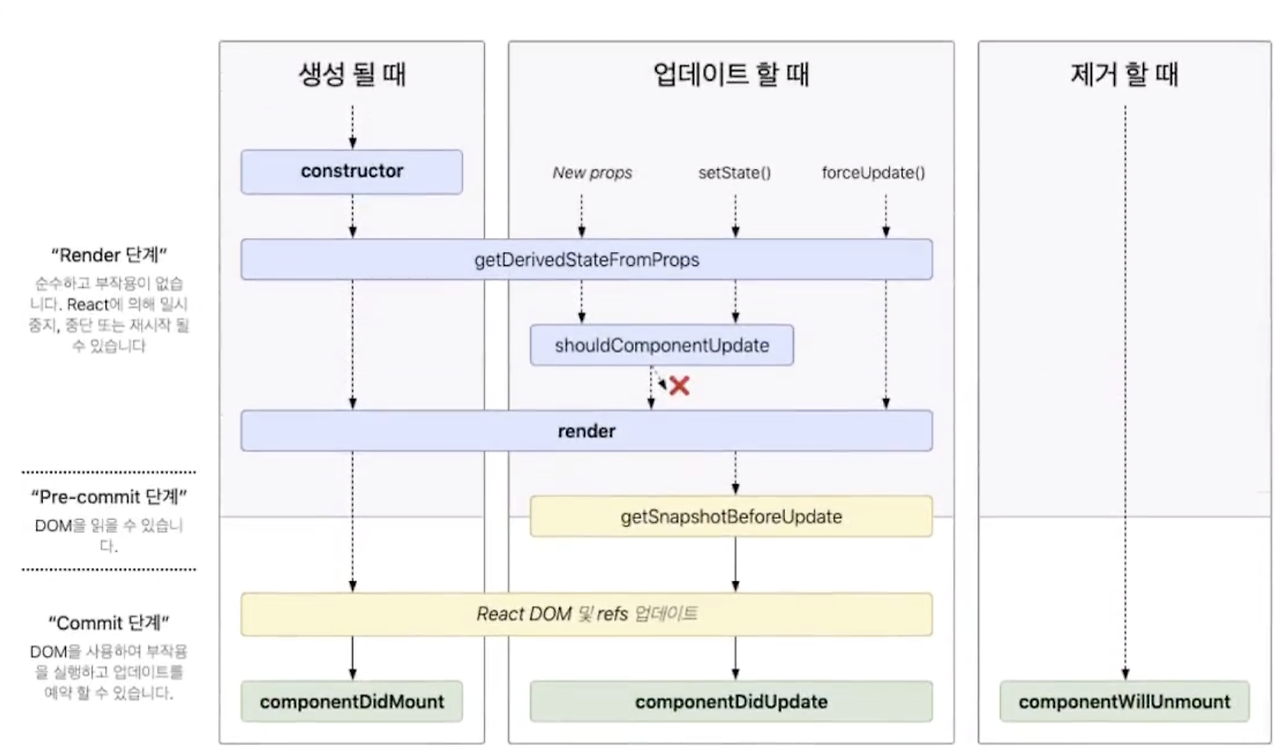 1. Class형 컴포넌트 생명주기 (1) 개요 리액트 생명주기를 알아야 useEffect 등 return문이 왜 그렇게 쓰였는지 알 수 있다. 컴포넌트가 생기고 죽을 때 어떤 과정이 생기는지 왜 그러는지 파악 (2) 생명주기(=컴포넌트 중심 라이브러리의 집합체) [Mount] -> [Update] -> [Unmount] 모든 컴포넌트에는 각각 생명주기가 존재한다. 각 생명주기에 맞는 매서드들이 있다. (3) 생명주기 1. Mount (1) 개요 컴포넌트가 생성될 때 (2) 매서드 1. constructor 컴포넌트가 맨 처음 만들어질 때 호출 생성자 2. getDerivedStateFromProps 부모 컴포넌트로부터 props를 전달받을 때, state에 값을 일치시키는 역할을 하는 매서드 마운트 될 때, 업데이트(리렌더링)될 때도 호출 3. render 최초 마운트가 준비완료되면 호출되는 즉, 렌더링 하는 매서드 컴포넌트를 DOM에 마운트하기 위해 사용 4. componentDidMount 컴포넌트가 브라우저에 표시된 후 호출되는 매서드 2. Update (1) 개요 컴포넌트가 갱신될 때 (리렌더링) 리렌더링이란 1. state, 2. props, 3. 부모 컴포넌트 가 변경이 될 때를 말한다. +4. (클래스형 컴포넌트에서) 강제적으로 업데이트 될 때 (2) 매서드 1. getDerivedStateProps 마운트 과정에서도 동일하게 호출되었던 메서드 부모 컴포넌트로부터 props를 전달 받을 때 state 값을 일치시키는 역할 2. shouldComponentUpdate 리렌더링 여부 판단(함수 호출 결과 – true(리렌더링 O)/false(리렌더링 X)) 함수형 컴포넌트에서 memo, useMemo, useCallback이 열할을 대신한다 3. render 변경사항이 반영 다 되어 준비완료되면 호출되는(렌더링) 매서드 컴포넌트를 DOM에 마운트하기 위해 사용 4. getSnapshotBeforeUpdate 컴포넌트에 변화가 일어나기 직전 DOM의 상태를 지정 componentDidUpdate 함수에서 사용하기 위한 스냅샷형태 데이터 5. componentDidUpdate 컴포넌트 업데이트 작업 완료 후 호출 3. Unmount (1) 개요 컴포넌트가 DOM에서 제거되는 시점 (2) 매서드 1. componentWillUnmount 컴포넌트가 사라지기 전 호출되는 매서드 useEffect의 return과 동일 2. 함수형 컴포넌트 생명주기 (1) 개요 리액트에서 Hook은 함수형 컴포넌트에서 React state와 생명주기 기능을 연동 할 수 있게 해주는 함수 Hook은 class 안에서는 동작하지 않고, class없이 React를 사용할 수 있게 함 (2) 생명주기 (3) 리액트 훅을 도입한 목적 기존의 라이프사이클 메서드 기반이 아닌 로직 기반으로 나눌 수 있어서 컴포넌트를 함수 단위로 잘게 쪼갤 수 있다는 이점 라이프사이클 메서드에는 관련 없는 로직이 자주 섞여 들어가는데, 이로인해 버그가 쉽게 발생하고, 무결성을 쉽게 해친다 (4) 훅 사용규칙 1. 최상위 에서만 Hook을 호출해야 한다 반복문, 조건문, 중첩된 함수 내에서 Hook을 실행하면 안 됨 이 규칙을 따르면 컴포넌트가 렌더링될 때마다 항상 동일한 순서로 Hook이 호출되는 것이 보장 2. 리액트 함수 텍스트컴포넌트에서만 Hook을 호출해야 한다 일반 JS함수에서는 Hook을 호출해서는 안된다. 1. useState 상태를 관리, [state이름, setter이름] 순으로 반환 받아서 사용 const [state, setState] = useState(initialState); 2. useEffect 화면에 렌더링이 완료된 후에 수행되며componentDidMount와 componentDidUpdate, componentWillUnmount가 합쳐진 것 useEffect(() => {}); // 렌더링 결과가 실제 돔에 반영된 후마다 호출