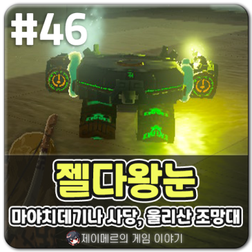 안녕하세요 게임 블로거 제이메르입니다. 이제 추낙 지방에 있는 울리산 조망대를 활성화해 보겠습니다. 그 주변에 있는 사당 공략도 함께 다뤄보도록 할게요! #46 젤다의 전설 왕국의 눈물 공략 (티어스 오브 더 킹덤) 마야치데기나의 사당, 울리산 조망대 [ 맨몸 전투 추적 ] 1. 울리산 조망대 가는법 산 때문에 조망대가 잘 보이지 않습니다. 시츠모이의 사당에 워프한 뒤, 데스마운틴 정상에서 내려다보니까 제대로 보이더라고요. 맵핀은 이쯤에 찍힙니다. 데스마운틴에서 패러세일을 타고 날아가면 편하게 올 수 있습니다. 울리산 조망대 도착입니다. 조망대 주변에는 카쿠다가 날아다니고 있는데, 활을 쏴서 잡아줍니다. 맞추기 어렵다면 화살에 키이스의 눈알을 붙여 쏘면 됩니다. 그럼 100% 명중합니다. 이후 카쿠다가 쓰러진 곳으로 가면, 풀숲에 단말이 떨어져 있는 걸 볼 수 있습니다. 이걸 들고 조망대로 갑니다. 조망대로 가서 NPC 사우슨에게 대화를 걸면, 마침 단말을 몬스터한테 빼앗겼단 이야기를 합니다. 이때 들고 있던 단말을 울트라 핸드로 적절한 위치에 배치해 줍니다. 이후 정상적으로 연결된 단말과 상호작용하면 맵 정보를 입수할 수 있습니다. 2. 젤다 왕눈 마야치데기나의 사당 위치 조망대 바로 옆에는 마야치데기나의 사당이 있습니다. 바로 들어가 보도록 하겠습니다. 🙂 3. 마야치데기나의 사당 공략 부제는 ‘맨몸 전투 추적’입니다. 이번 사당은 일시적으로 아이템을 반납하고, 맨몸으로 진행하게 됩니다. 사당 내에 있는 오브젝트를 적절히 활용해 골렘들을 모두 무찔러야 합니다. 장비가 없는 상황이기 때문에 조심조심 이동해야 합니다. 먼저 앞의 나무 봉을 주워줍니다. 추적 수레 앞에는 가시가 달려 있습니다. 이 수레를 한 대 치면, 주변에 있는 몬스터를 추적하는데요. 앞쪽에 붙어있는 가시로 피해를 줄 수 있습니다. 이걸로 앞에 있는 몬스터를 잡아줍니다. 이어서 앞에 있는 굵은 봉, 낡은 나무 활, 나무 화살 10개를 전부 챙깁니다. 이 앞쪽에는 더 많은 골렘들이 있습니다. 여기서 막 돌아다니면 죽을 수 있으니 조심하세요. 우선, 보유하고 있는 추적 수레 2개를 앞쪽에 배치해, 작동해 줍니다. 이때 너무 멀리 가지 마세요. 어그로가 끌릴 수 있으니까요. 이 정도 거리면 충분합니다. 수레를 친 뒤, 빠르게 벽 뒤에 숨어서 기다립니다. 이렇게 하지 않고 안으로 가면, 골렘들이 플레이어를 쫓아옵니다. 벽 뒤에서 대기하면 골렘들이 추적 수레에 정신이 팔리게 됩니다. *실수로 어그로가 끌렸다면, 사당 입구 뒤에 호다닥 숨는 방법이 있습니다. 골렘들이 추적 수레를 바라보고 있는 틈을 타, 왼쪽 언덕으로 올라갑니다. 여기로 가면 수레가 하나 더 있습니다. 울트라 핸드로 옆에 있는 화룡의 머리를 수레에 붙인 뒤, 발동해 줍니다. 이제 뒤쪽으로 빙 돌아서, 반대쪽 언덕으로 올라갑니다. 이후 벽에 붙어 있는 플랫폼으로 날아가면, 여기도 수레가 있습니다. 울트라 핸드로 빙룡의 머리와 광선 머리를 양쪽에 붙인 뒤, 골렘이 있는 1층에 배치하여 가동해 줍니다. 이후 중앙으로 올라가면 철구가 있습니다. 스크래빌드를 사용해 무기에 붙여줍니다. 만약 몬스터가 가까이 왔다면, 철구를 붙인 무기를 휘둘러 몸을 보호할 수 있습니다. 최상층에는 활을 쏘는 골렘이 있습니다. 이 친구는 화살로 눈을 쏜 뒤, 아래층으로 떨어트리면 됩니다. 여기에는 대포가 있는데, 대포는 초보자가 다루기 어려우니 사용하지 않는 걸 권장 드립니다. 쓰다가 플레이어가 죽을 수도 있거든요. 중간에 골렘의 공격을 받아 뒤집어졌거나, 고장 난 추적 수레도 있을 겁니다. 이런 건 다시 울트라 핸드로 일으켜서 몬스터 주변에 배치한 뒤, 다시 쳐주면 정상적으로 작동합니다. 전부 처치 시 출구가 열립니다. 출구 바로 앞에는 보물상자가 있는데요. 고생한 만큼 공격력이 상당히 높은 상등대장 스피어를 획득할 수 있습니다! 저는 3번 정도 트라이해서 클리어했네요. 다들 고생 많으셨습니다. 지금까지 젤다의 전설 왕국의 눈물 (젤다의 전설 티어스 오브 더 킹덤) 마야치데기나의 사당 왕눈 공략을 전해드렸습니다. 도움이 되었기를 바랍니다.