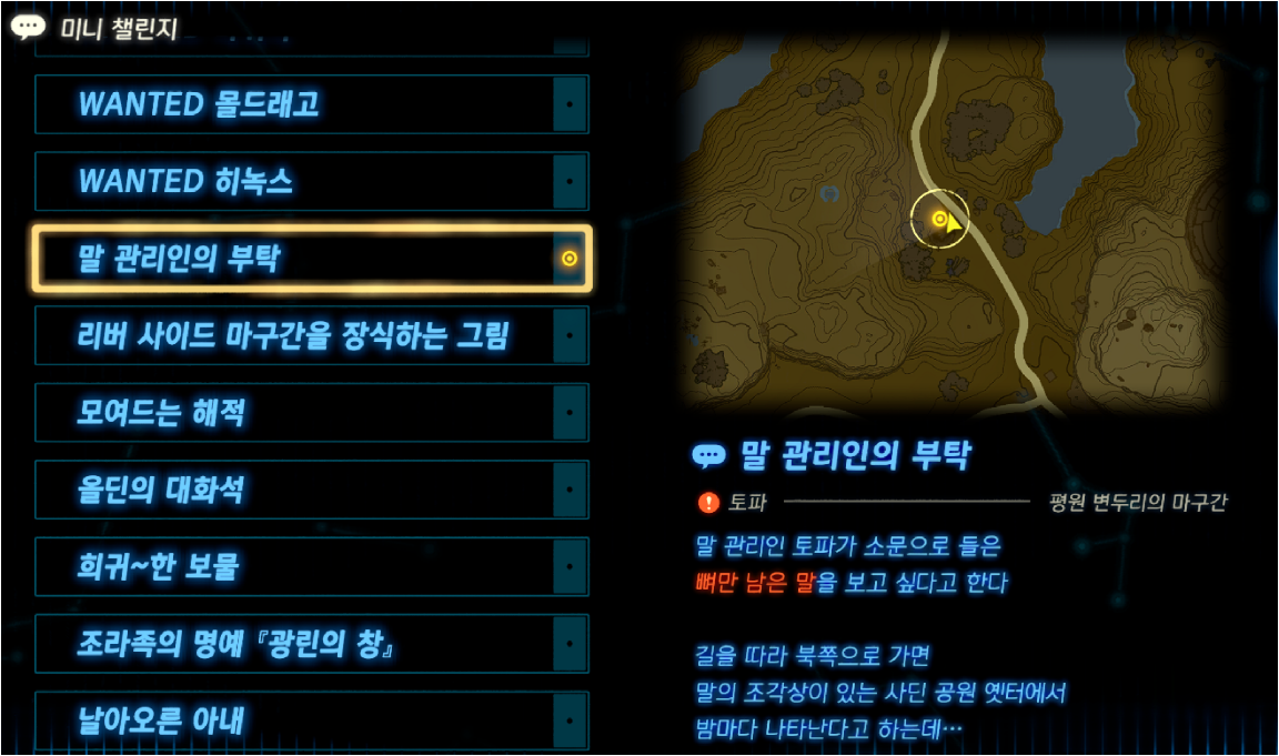 평원 변두리의 마구간에 있는 토파라는 말 관리인이 뼈만 남은 말을 보고 싶다며, 링크에게 찾아 달라는 의뢰를 합니다. 평원 변두리의 마구간에서 북쪽으로 길을 따라 계속 가다 보면 사토리 산 동쪽에 사딘 공원 옛터에 도착할 수 있습니다. (중앙 하이랄 지역 7시 방향) 사딘 공원의 옛터에 있는 말 조각상의 모습 모닥불을 만들어 밤으로 시간을 변경한 후 주위를 둘러 보면 멀지 않은 곳에서 뼈만 남은 말을 쉽게 찾을 수 있습니다. (사딘의 옛터 분수대 정면쯤의 위치) 살이 없어 왜소해 보이는 해골마 살금살금 다가가거나, 글라이딩을 이용해 공중에서 착지해서 올라탄 후 평원 변두리의 마구간을 돌아가면 퀘스트가 해결 됩니다. 아쉽게도 마구간에 맡길 수는 없네요.